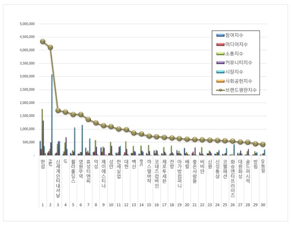 4위, LF ( 대표 김상균 ) 브랜드는 참여지수 54,850 미디어지수 151,504 소통지수 494,488 커뮤니티지수 688,095 시장지수 248,696 사회공헌지수 14,632가 되면서 브랜드평판지수 1,652,264로 분석됐다. 지난 8월 브랜드평판지수 2,252,064와 비교하면 26.63% 하락했다.