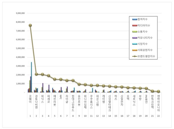 한국기업평판연구소 구창환 소장은 "2022년 9월 가정용품 상장기업 브랜드평판 분석결과, 코웨이 브랜드가 1위를 기록했다. 2022년 9월 가정용품 상장기업 브랜드 카테고리 빅데이터 분석을 해보니 브랜드소비 15.51% 하락, 브랜드이슈 9.45% 하락, 브랜소통 9.45% 하락, 브랜드확산 2.37% 하락, 브랜드시장 13.15% 하락, 브랜드공헌 5.79% 하락했다"라고 밝혔다.