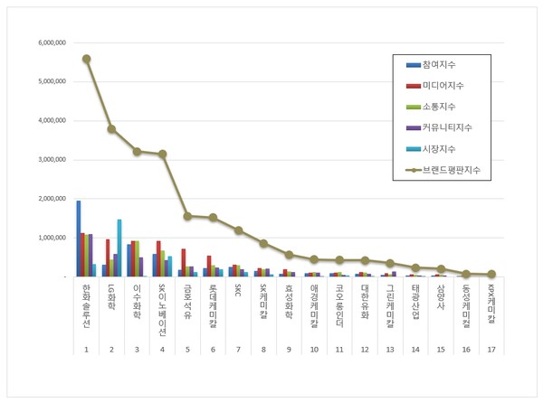 석유화학 관련 상장기업 브랜드평판 1위를 기록한 한화솔루션 ( 대표 이구영, 류두형, 김동관, 김은수, 남이현 ) 브랜드는 참여지수 1,952,621 미디어지수 1,128,573 소통지수 1,080,495 커뮤니티지수 1,102,028 시장지수 324,134가 되면서 브랜드평판지수 5,587,851로 분석되었다. 지난 8월 브랜드평판지수 5,144,836과 비교하면 8.61% 상승했다.
