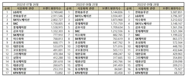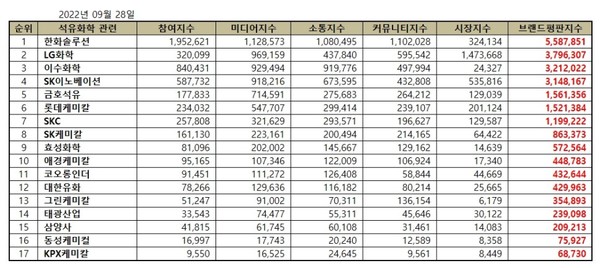 석유화학 관련 상장기업 브랜드평판 2022년 9월 빅데이터 분석 순위는 한화솔루션, LG화학, 이수화학, SK이노베이션, 금호석유, 롯데케미칼, SKC, SK케미칼, 효성화학, 애경케미칼, 코오롱인더, 대한유화, 그린케미칼, 태광산업, 삼양사, 동성케미컬, KPX케미칼 순이었다.