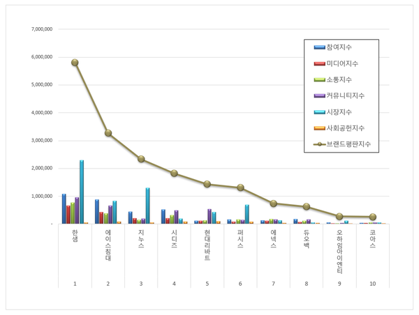 5위, 현대리바트 브랜드는 참여지수 119,900 미디어지수 112,919 소통지수 131,410 커뮤니티지수 543,197 시장지수 428,691 사회공헌지수 99,102가 되면서 브랜드평판지수 1,435,219로 분석됐다. 지난 8월 브랜드평판지수 1,637,914와 비교하면 12.38% 하락했다.