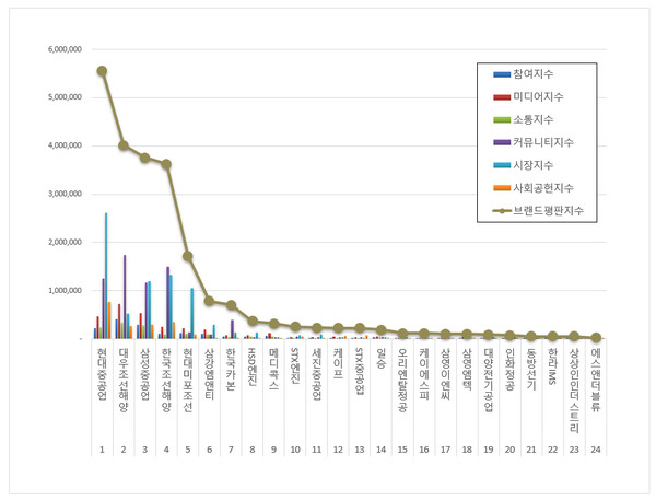 4위, 한국조선해양 ( 대표 가삼현, 정기선 ) 브랜드는 참여지수 110,876 미디어지수 243,633 소통지수 99,293 커뮤니티지수 1,492,723 시장지수 1,323,696 사회공헌지수 353,298이 되면서 브랜드평판지수 3,623,518로 분석됐다. 지난 9월 브랜드평판지수 3,728,876과 비교하면 3.15% 상승했다.