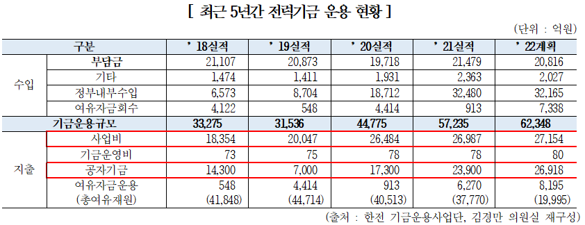 더불어민주당 김경만 의원(국회 산업통상자원중소벤처기업위원회 위원)이 한국전력공사(대표이사 사장 정승일, 한전)로부터 제출받은 자료에 따르면, 국민들이 전기요금의 3.7%씩 부담한 전력기금 부담금은 지난해 기준 2조 1,479억 원으로, 매년 전체 기금운영규모의 1/3 이상을 차지하는 주요 수입원이다.