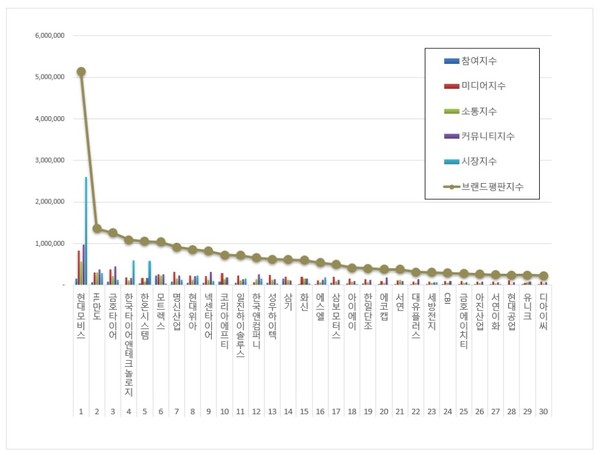자동차부품 상장기업 브랜드평판 1위를 기록한 현대모비스 ( 대표 정의선, 조성환 ) 브랜드는 참여지수 163,185 미디어지수 831,338 소통지수 563,433 커뮤니티지수 971,798 시장지수 2,608,815가 되면서 브랜드평판지수 5,138,569로 분석됐다. 지난 9월 브랜드평판지수 5,444,667과 비교하면 5.62% 하락했다.