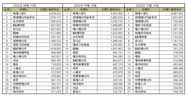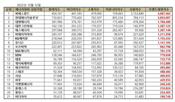 2022년 10월 에너지장비 상장기업 브랜드평판 빅데이터 분석 순위는 씨에스윈드, 현대에너지솔루션, 대명에너지, 대한그린파워, 에스에너지, 비에이치아이, KG케미칼, 유니슨, 오르비텍, SGC에너지, SDN, 태웅, 제이씨케미칼, 에코바이오, 스페코, 서남, 파루, 지엔원에너지, 플래스크, 윌링스, 비디아이 순이었다.