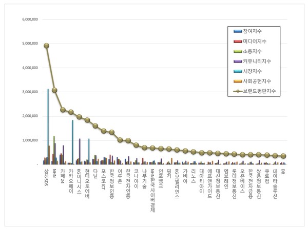 5위, KG이니시스 ( 대표 유승용 ) 브랜드는 참여지수 166,355 미디어지수 236,332 소통지수 254,331 커뮤니티지수 1,068,989 시장지수 115,258 사회공헌지수 124,881이 되면서 브랜드평판지수 1,966,146으로 분석됐다. 지난 9월 브랜드평판지수 1,585,245와 비교하면 24.03% 상승했다.