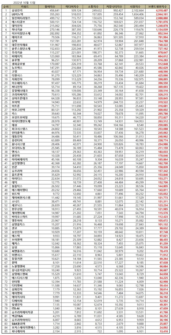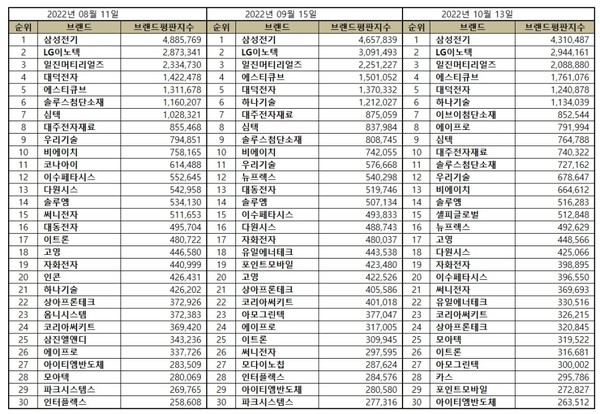 [이넷뉴스] 2022년 10월 전자장비 상장기업 브랜드평판이 공개됐다.
