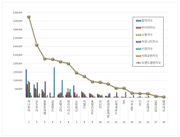 3위, 참좋은여행 ( 대표 조현문, 이종혁 ) 브랜드는 참여지수 480,546 미디어지수 372,756 소통지수 294,154 커뮤니티지수 951,408 시장지수 51,045 사회공헌지수 148,308이 되면서 브랜드평판지수 2,298,217로 분석됐다. 지난 9월 브랜드평판지수 2,277,075와 비교하면 0.93% 상승했다.