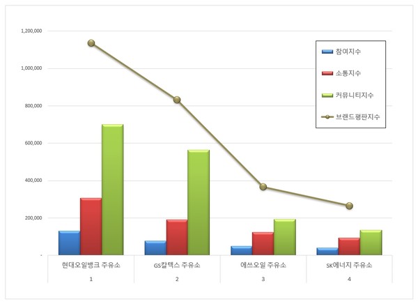주유소 브랜드평판 1위를 기록한 현대오일뱅크 주유소 브랜드는 참여지수 129,677 소통지수 307,245 커뮤니티지수 699,275가 되면서 브랜드평판지수 1,136,197이 되었다. 지난 9월 브랜드평판지수 900,296과 비교하면 26.20% 상승했다.