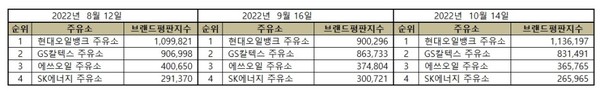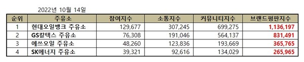 이넷뉴스와 한국기업평판연구소는 소비자들에게 사랑받는 주유소 브랜드에 대해 브랜드 빅데이터를 통한 평판조사를 하였다. 4개 주유소 브랜드평판 분석은 2022년 9월 14일부터 2022년 10월 14일까지의 주유소 브랜드 빅데이터 2,599,418개를 분석하여 소비자들의 브랜드 습관과 브랜드와 관계 분석을 통해 브랜드평판을 분석하였다. 지난 9월 브랜드 빅데이터 2,439,554개와 비교하면 6.55% 증가했다.