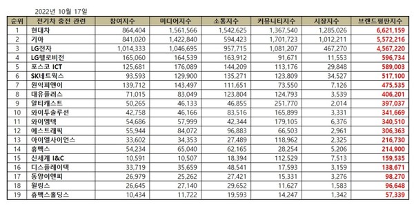 전기차 충전 관련 상장기업 브랜드평판 2022년 10월 빅데이터 분석 순위는 현대차, 기아, LG전자, LG헬로비전, 포스코 ICT, SK네트웍스, 원익피앤이, 대유플러스, 알티캐스트, 와이투솔루션, 와이엠텍, 에스트래픽, 아이엘사이언스, 휴맥스, 신세계 I&C, 디스플레이텍, 동양이엔피, 윌링스, 휴맥스홀딩스 순이었다.