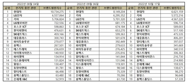 이넷뉴스 에너지 톱 브랜드위원회는 17일 전기차 충전 관련 상장기업 ‘2022년 10월 빅데이터 분석결과’를 발표했다. 발표에 따르면 1위 현대차 2위 기아 3위 LG전자 순으로 나타났다.