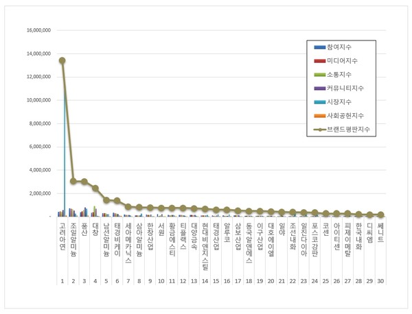 비철금속 상장기업 브랜드평판 1위를 기록한 고려아연 ( 대표 최윤범, 노진수, 백순흠 ) 브랜드는 참여지수 442,503 미디어지수 452,295 소통지수 416,508 커뮤니티지수 582,118 시장지수 11,403,648 사회공헌지수 127,386이 되면서 브랜드평판지수 13,424,457로 분석되었다. 지난 9월 브랜드평판지수 14,296,616과 비교하면 6.10% 하락했다.