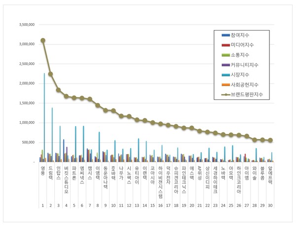 3위, 인탑스 ( 대표 김근하 ) 브랜드는 참여지수 236,196 미디어지수 228,381 소통지수 219,076 커뮤니티지수 153,185 시장지수 926,063 사회공헌지수 76,145가 되면서 브랜드평판지수 1,839,045로 분석됐다. 지난 9월 브랜드평판지수 1,591,046과 비교하면 15.59% 상승했다.