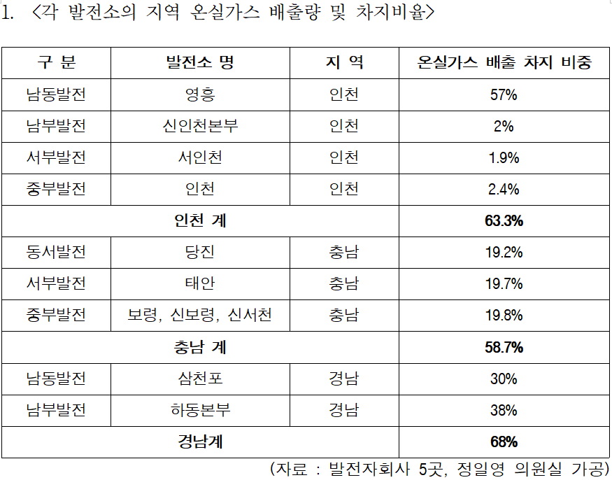 국회 산업통상자원중소벤처기업위원회 소속 더불어민주당 정일영 의원(인천 연수을)이 한전 발전자회사 5곳으로부터 제출받은 ‘시·도 온실가스배출량에서의 차지비율’에 따르면, 2019년 기준 남동발전·남부발전·동서발전·서부발전·중부발전이 운영하는 발전소의 지역 온실가스 배출 비중은 인천 63.3%, 경남 68%로 충남 58.7%로 이 세 지역에서만 각각 절반 이상을 차지하는 것으로 확인됐다.