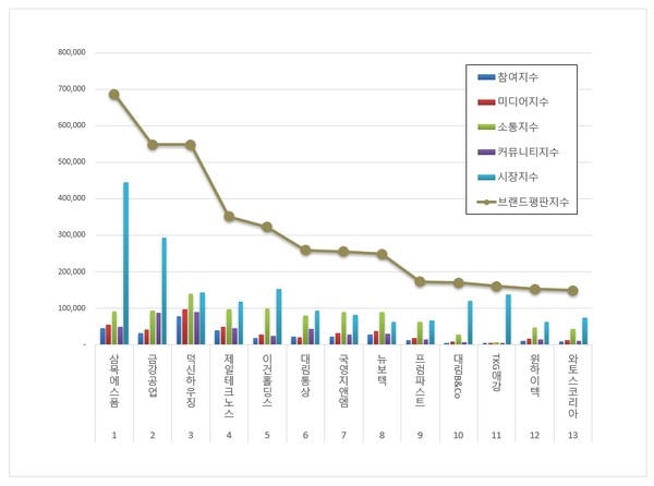 2위, 금강공업 ( 대표 전장열, 이범호 ) 브랜드는 참여지수 32,481 미디어지수 41,262 소통지수 94,005 커뮤니티지수 88,148 시장지수 292,421이 되면서 브랜드평판지수 548,316으로 분석됐다. 지난 9월 브랜드평판지수 550,204와 비교하면 0.34% 하락했다.