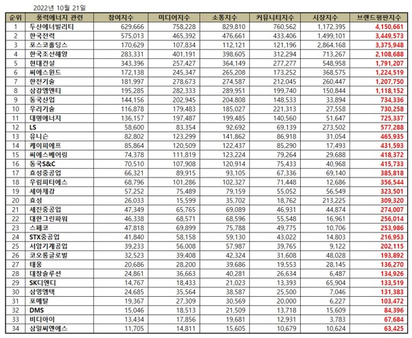 이넷뉴스 에너지 톱 브랜드위원회는 21일 풍력에너지 관련 상장기업 ‘2022년 10월 빅데이터 분석결과’를 발표했다. 발표에 따르면, 1위 두산에너빌리티(구 두산중공업) 2위 한국전력 3위 포스코홀딩스 순으로 나타났다.