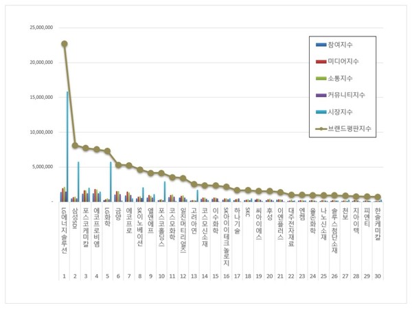 5위, LG화학 ( 대표 신학철 ) 브랜드는 참여지수 271,318 미디어지수 371,571 소통지수 489,192 커뮤니티지수 380,360 시장지수 5,774,412가 되면서 브랜드평판지수 7,286,853으로 분석되었다. 지난 9월 브랜드평판지수 7,341,403과 비교하면 0.74% 하락했다.