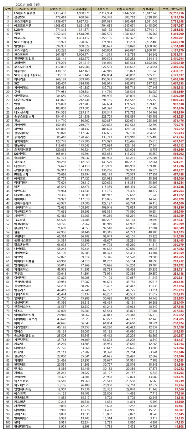 이넷뉴스와 한국기업평판연구소는 2차전지 관련 상장기업 101개 브랜드에 대해서 빅데이터 분석을 활용한 브랜드 평판조사를 실시하였다. 2022년 9월 24일부터 2022년 10월 24일까지의 2차전지 관련 상장기업 브랜드 빅데이터 129,186,869개를 분석하여 소비자들의 브랜드 평판을 분석하였다. 지난 9월 2차전지 관련 상장기업 브랜드 빅데이터 133,664,908개와 비교하면 3.35% 줄어들었다.