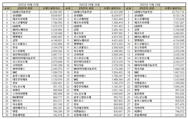 [이넷뉴스] 2022년 10월 2차전지 관련 상장기업 브랜드평판이 공개됐다.