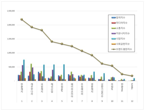 5위, 무림P&P ( 대표 이도균 ) 브랜드는 참여지수 202,875 미디어지수 170,095 소통지수 222,916 커뮤니티지수 73,285 시장지수 597,330 사회공헌지수 59,570이 되면서 브랜드평판지수 1,326,070으로 분석됐다. 지난 9월 브랜드평판지수 1,488,662와 비교하면 10.92% 하락했다.