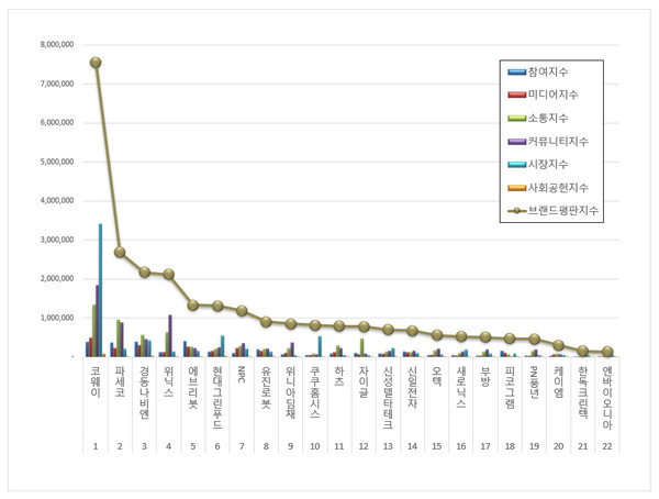 한국기업평판연구소 구창환 소장은 "2022년 10월 가정용품 상장기업 브랜드평판 분석결과, 코웨이 브랜드가 1위를 기록했다. 2022년 10월 가정용품 상장기업 브랜드 카테고리 빅데이터 분석을 해보니 브랜드소비 5.65% 하락, 브랜드이슈 4.43% 하락, 브랜소통 7.29% 상승, 브랜드확산 12.78% 하락, 브랜드시장 3.30% 하락, 브랜드공헌 2.25% 상승했다"라고 밝혔다.