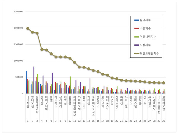 생물공학 상장기업 브랜드평판 분석은 참여지수, 소통지수, 커뮤니티지수, 시장지수로 구분하여 브랜드평판지수를 산출했다.