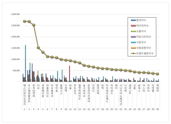 건강관리장비용품 상장기업 브랜드평판 분석은 참여지수, 미디어지수, 소통지수, 커뮤니티지수, 시장지수, 사회공헌지수로 구분하여 브랜드평판지수를 산출했다.