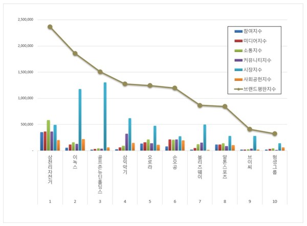 5위, 오로라 ( 대표 홍기선 ) 브랜드는 참여지수 134,072 미디어지수 160,652 소통지수 217,971 커뮤니티지수 144,770 시장지수 474,977 사회공헌지수 111,511이 되면서 브랜드평판지수 1,243,951로 분석됐다. 지난 8월 브랜드평판지수 1,643,149와 비교하면 24.29% 하락했다.