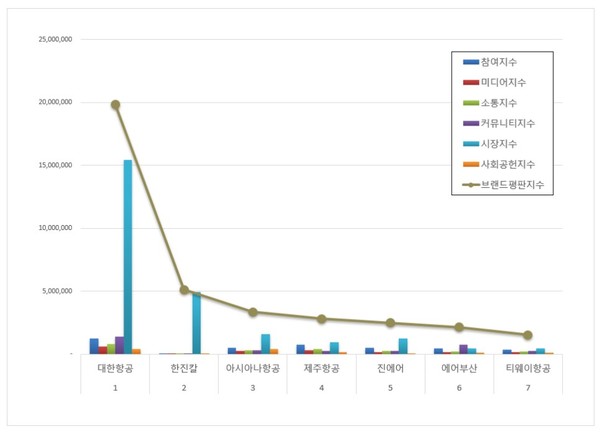항공사 상장기업 브랜드평판 분석은 참여지수, 미디어지수, 소통지수, 커뮤니티지수, 시장지수, 사회공헌지수로 구분하여 브랜드평판지수를 산출했다.