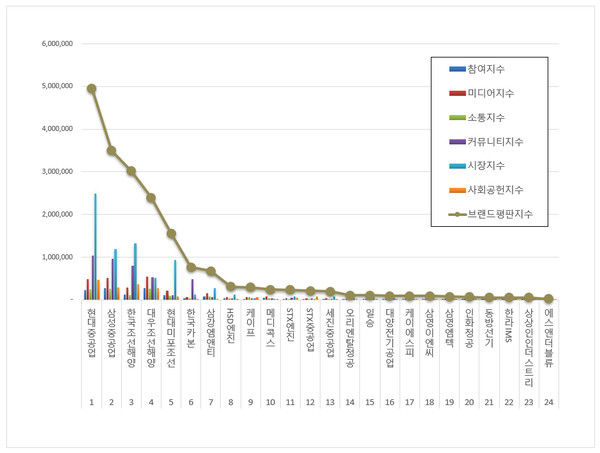 3위, 한국조선해양 ( 대표 가삼현, 정기선 ) 브랜드는 참여지수 129,581 미디어지수 285,643 소통지수 112,979 커뮤니티지수 793,599 시장지수 1,329,135 사회공헌지수 367,274가 되면서 브랜드평판지수 3,018,211로 분석됐다. 지난 10월 브랜드평판지수 3,623,518과 비교하면 16.70% 하락했다.