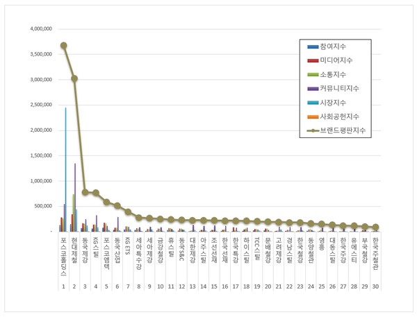 2위, 현대제철 ( 대표 안동일 ) 브랜드는 참여지수 146,867 미디어지수 344,785 소통지수 736,596 커뮤니티지수 1,348,147 시장지수 437,077 사회공헌지수 13,506이 되면서 브랜드평판지수 3,026,978로 분석됐다. 지난 10월 브랜드평판지수 3,296,509와 비교하면 8.18% 하락했다.