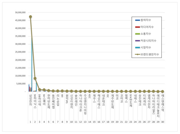 2위, SK하이닉스 ( 대표 박정호, 관노정 ) 브랜드는 참여지수 547,476 미디어지수 576,720 소통지수 725,103 커뮤니티지수 759,286 시장지수 5,897,827이 되면서 브랜드평판지수 8,506,412로 분석됐다. 지난 10월 브랜드평판지수 9,308,949와 비교하면 8.62% 하락했다.