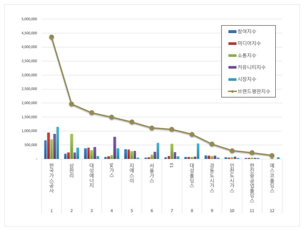 가스 유틸리티 상장기업 브랜드평판 1위를 기록한 한국가스공사 ( 대표 채희봉 ) 브랜드는 참여지수 670,722 미디어지수 941,108 소통지수 711,295 커뮤니티지수 899,565 시장지수 1,147,089가 되면서 브랜드평판지수 4,369,778로 분석되었다. 지난 10월 브랜드평판지수 3,893,107과 비교하면 12.24% 상승했다.