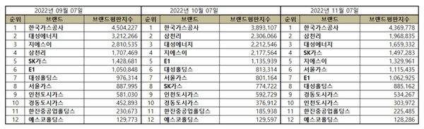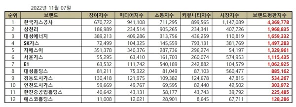 [이넷뉴스] 2022년 11월 가스 유틸리티 상장기업 브랜드평판이 공개됐다.