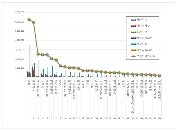 생명과학서비스 상장기업 브랜드평판 분석은 참여지수, 미디어지수, 소통지수, 커뮤니티지수, 시장지수, 사회공헌지수로 구분하여 브랜드평판지수를 산출했다.