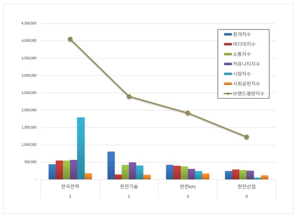 전기 유틸리티 상장기업 브랜드평판 1위를 기록한 한국전력 ( 대표 정승일, 한국전력공사 ) 브랜드는 참여지수 435,037 미디어지수 541,718 소통지수 543,066 커뮤니티지수 564,748 시장지수 1,796,350 사회공헌지수 176,208이 되면서 브랜드평판지수 4,057,125로 분석되었다. 지난 9월 브랜드평판지수 6,953,582와 비교하면 41.65% 하락했다.