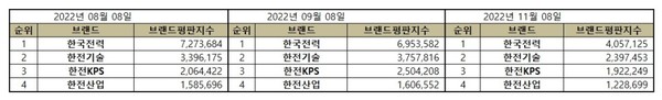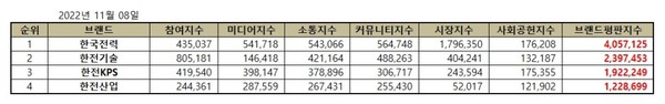 2022년 11월 전기 유틸리티 상장기업 브랜드평판 순위는 한국전력, 한전기술, 한전KPS, 한전산업 순으로 분석되었다.