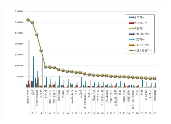 3위, 한글과컴퓨터 ( 대표 변성준, 김연수 ) 브랜드는 참여지수 447,860 미디어지수 192,420 소통지수 206,341 커뮤니티지수 357,494 시장지수 762,555 사회공헌지수 459,019가 되면서 브랜드평판지수 2,425,6889로 분석됐다. 지난 9월 브랜드평판지수 2,264,858과 비교하면 7.10% 상승했다.