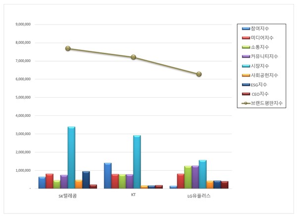 통신 상장기업 브랜드평판 1위를 기록한 SK텔레콤 ( 대표 유영상 ) 브랜드는 참여지수 642,999 미디어지수 813,204 소통지수 452,881 커뮤니티지수 754,135 시장지수 3,387,825 사회공헌지수 467,710 ESG지수 954,512 CEO지수 213,259가 되면서 브랜드평판지수 7,686,524로 분석됐다. 지난 10월 브랜드평판지수 8,182,167과 비교하면 6.06% 하락했다.