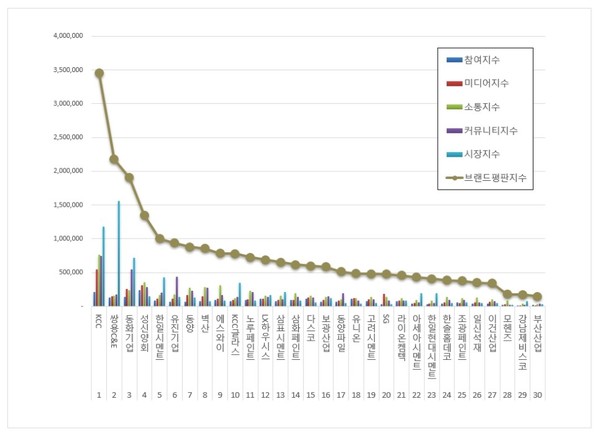 - KCC, 건축자재 상장기업 브랜드평판 1위···쌍용C&E·동화기업 뒤쫓아