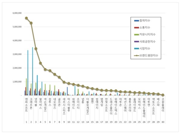 게임 상장기업 브랜드평판 1위를 기록한 엔씨소프트 ( 대표 김택진 ) 브랜드는 참여지수 359,331 소통지수 609,012 커뮤니티지수 1,254,749 사회공헌지수 119,276 시장지수 3,297,403이 되면서 브랜드평판지수 5,639,772로 분석됐다. 지난 10월 브랜드평판지수 4,196,922와 비교하면 34.38% 상승했다.