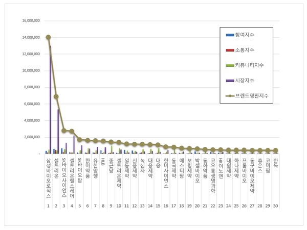 4위, 셀트리온헬스케어 ( 대표 김형기 ) 브랜드는 참여지수 221,687 소통지수 164,109 커뮤니티지수 165,149 시장지수 2,187,064가 되면서 브랜드평판지수 2,738,008로 분석됐다. 지난 10월 브랜드평판지수 2,985,230과 비교하면 8.28% 하락했다.