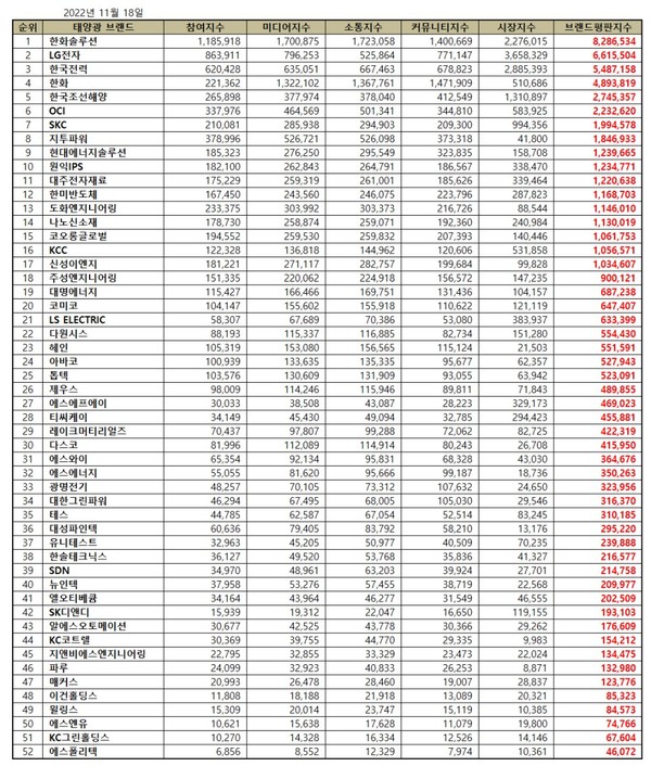 이넷뉴스 에너지 톱 브랜드위원회는 18일 태양광에너지 관련 상장기업 ‘2022년 11월 빅데이터 분석결과’를 발표했다. 발표에 따르면, 1위 한화솔루션 2위 LG전자 3위 한국전력 순으로 나타났다.