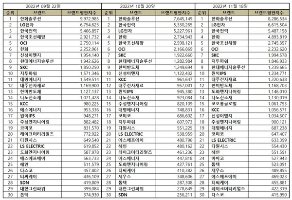 [이넷뉴스] 2022년 11월 태양광에너지 관련 상장기업 브랜드평판이 공개됐다.