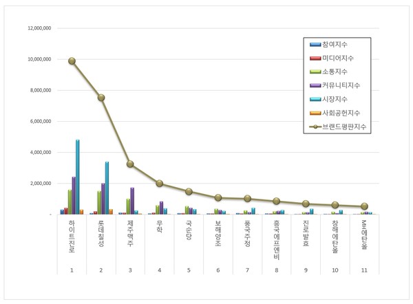 4위, 무학 ( 대표 최재호, 최낙준 ) 브랜드는 참여지수 67,069 미디어지수 107,315 소통지수 577,201 커뮤니티지수 834,883 시장지수 383,113 사회공헌지수 27,466이 되면서 브랜드평판지수 1,997,047로 분석됐다. 지난 10월 브랜드평판지수 2,154,603과 비교하면 7.31% 하락했다.
