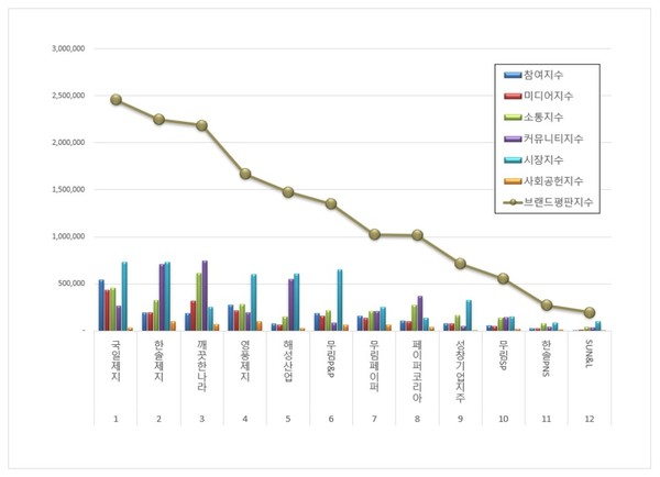 2위, 한솔제지 ( 대표 한철규 ) 브랜드는 참여지수 191,581 미디어지수 190,695 소통지수 324,578 커뮤니티지수 707,142 시장지수 732,290 사회공헌지수 99,376이 되면서 브랜드평판지수 2,245,662로 분석됐다. 지난 10월 브랜드평판지수 2,196,375와 비교하면 2.24% 상승했다.