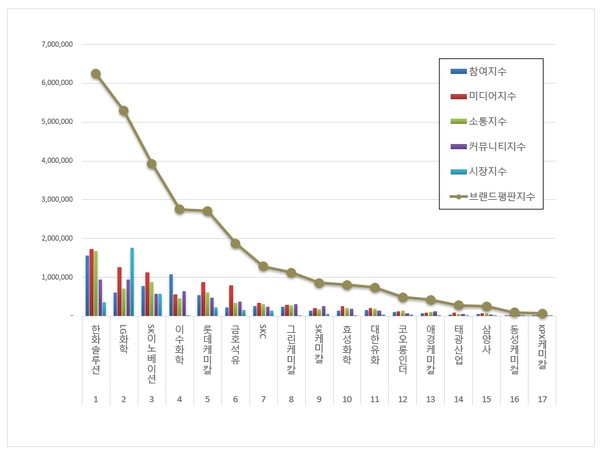 석유화학 관련 상장기업 브랜드평판 1위를 기록한 한화솔루션 ( 대표 이구영, 류두형, 김동관, 김은수, 남이현 ) 브랜드는 참여지수 1,553,529 미디어지수 1,725,090 소통지수 1,677,212 커뮤니티지수 933,822 시장지수 355,250이 되면서 브랜드평판지수 6,244,904로 분석되었다. 지난 10월 브랜드평판지수 6,423,060과 비교하면 2.77% 하락했다.