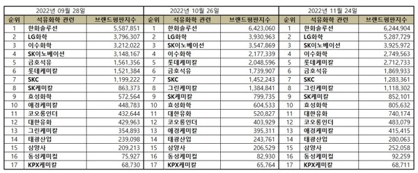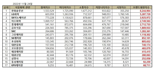 석유화학 관련 상장기업 브랜드평판 2022년 11월 빅데이터 분석 순위는 한화솔루션, LG화학, SK이노베이션, 이수화학, 롯데케미칼, 금호석유, SKC, 그린케미칼, SK케미칼, 효성화학, 대한유화, 코오롱인더, 애경케미칼, 태광산업, 삼양사, 동성케미컬, KPX케미칼 순이었다.
