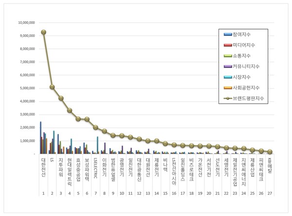 한편, 이넷뉴스 에너지 톱 브랜드위원회와 한국기업평판연구소는 매달 국내 에너지 기업 및 브랜드 평판지수를 측정해 변화량을 발표하고 있다. 국내 에너지 업계 현황을 파악하고, 에너지 산업을 전망하는 데 중요 지표가 되고 있다는 평가를 받고 있다.